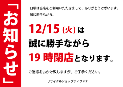 日頃はリサイクルショップティファナを御利用いただきましてありがとうございます。 12/15(火)の営業は社員研修の為、誠に勝手ながら 19時閉店とさせて頂きます。 お客様には御不便をお掛けしますが、 何卒、御理解くださいますようお願いいたします。 12/16(水)は通常とおり am 11:00からの営業となりますのでご来店お待ちしております。 |