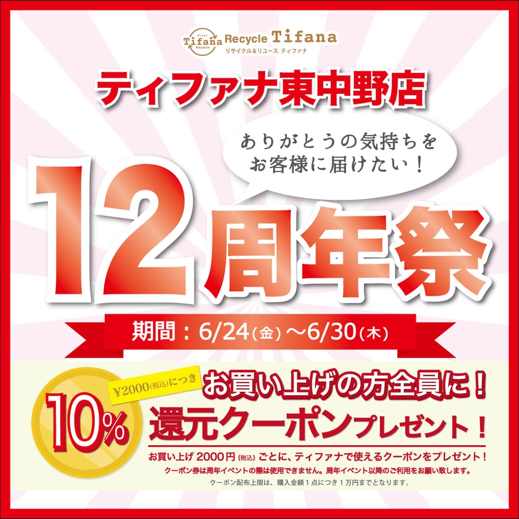 リサイクルショップ ティファナ > 東中野店 12周年祭開催!